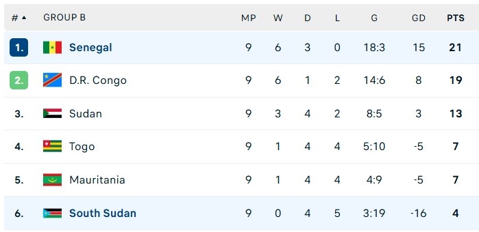 Lần lượt Ismaila Sarr (29', 54'), Sadio Mane (46'), Nicolas Jackson (60'), Cherif Ndiaye (75') lập công, giúp "Sư tử Teranga" thắng đậm trên sân Juba. Kết thúc 9 lượt trận, Mane cùng đồng đội có 21 điểm, hơn Cộng hòa Congo 2 điểm. Ở lượt cuối, Senegal chỉ cần thắng đối thủ đứng áp chót bảng xếp hạng là Mauritania để giành vé đến World Cup 2026.