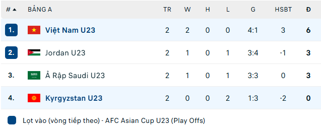 Sau 2 lượt đấu, U23 Việt Nam đứng đầu bảng A với 6 điểm và hiệu số +3 (4-1), tiếp theo là U23 Jordan và U23 Saudi Arabia cùng với 3 điểm. U23 Kyrgyzstan đứng bét bảng với 0 điểm nhưng vẫn còn cơ hội đi tiếp.