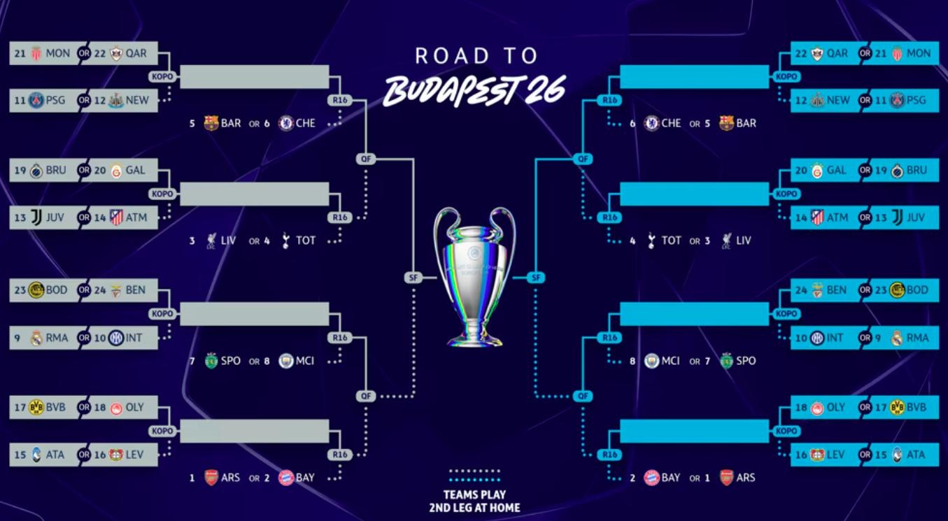 Liverpool kết thúc vòng bảng ở vị trí thứ 3 và được xếp cặp với Tottenham. Hai đại diện Anh này sẽ đối đầu Club Brugge, Galatasaray, Juventus hoặc Atletico Madrid ở vòng 1/8.