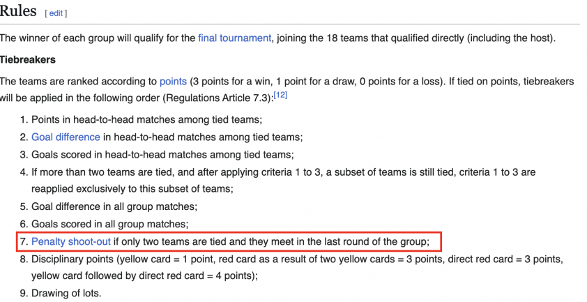 Loạt penalty sẽ được dùng đến nếu 2 đội cân bằng nhau ở mọi chỉ số và gặp nhau ở lượt trận cuối