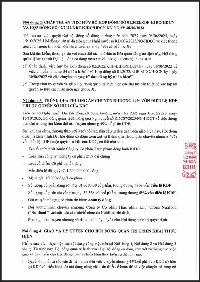 HĐQT KIDO trình cổ đông chấp thuận việc hủy bỏ Hợp đồng số02/2022/KDF-KIDO/HĐCN ký ngày 30/06/2022 về việc chuyển nhượng 34 nhãn hiệu(bao gồm các thương hiệu như Merino, Celano, Wel Yo...) và Hợp đồng số01/2022/KDF-KIDO/HĐCN ký ngày 30/06/2022 về việc chuyển nhượng 07 đơn đăng kýnhãn hiệu.