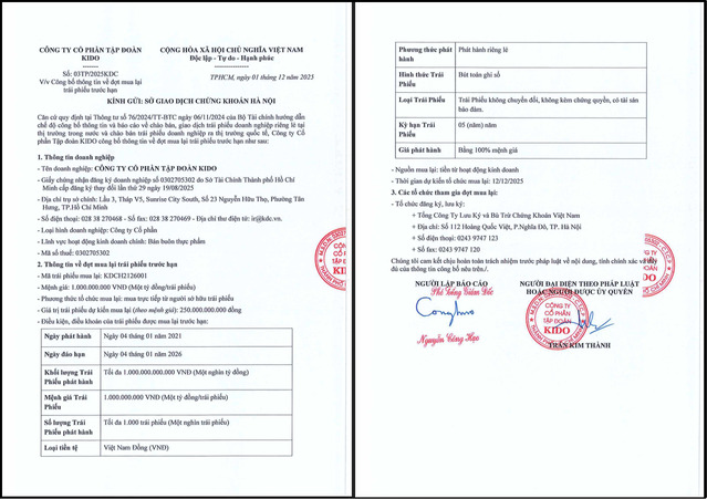 Trước đó, kể từ đầu tháng 1/2023 đến tháng 1/2025, KIDO đã 3lần thực hiện mua lại trước hạn một phần của lô trái phiếu nêu trên. Gần nhất,ngày 6/1/2025, doanh nghiệp thực hiện mua lại giá trị 250 tỷ đồng, đưa giá trịcòn lại lưu hành của lô trái phiếu về mức 250 tỷ đồng như hiện tại.