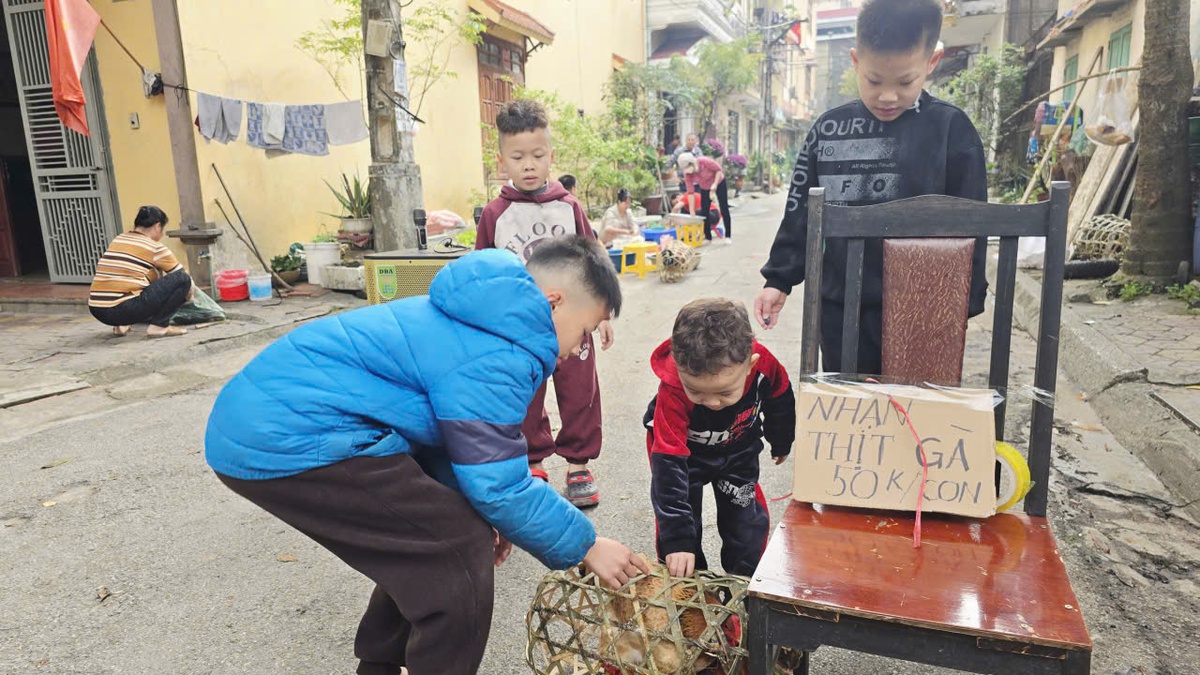 Điểm nhận thịt gà thuê ở đường Nguyễn Thái Học, phường Lương Văn Tri cũng thu hút các cháu nhi đồng