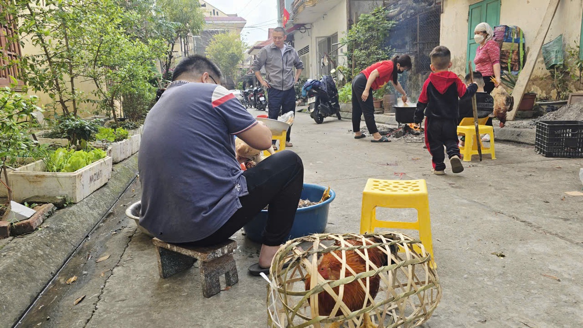 Sáng 16/2 (tức ngày 29 tháng Chạp năm Ất Tỵ), trời nắng vàng, ngay từ sớm, từng tốp khoảng 4-5 người (trong đó đa phần là phụ nữ trung tuổi) nấu nồi nước to, trải nilon rộng để sẵn sàng thịt gà thuê.