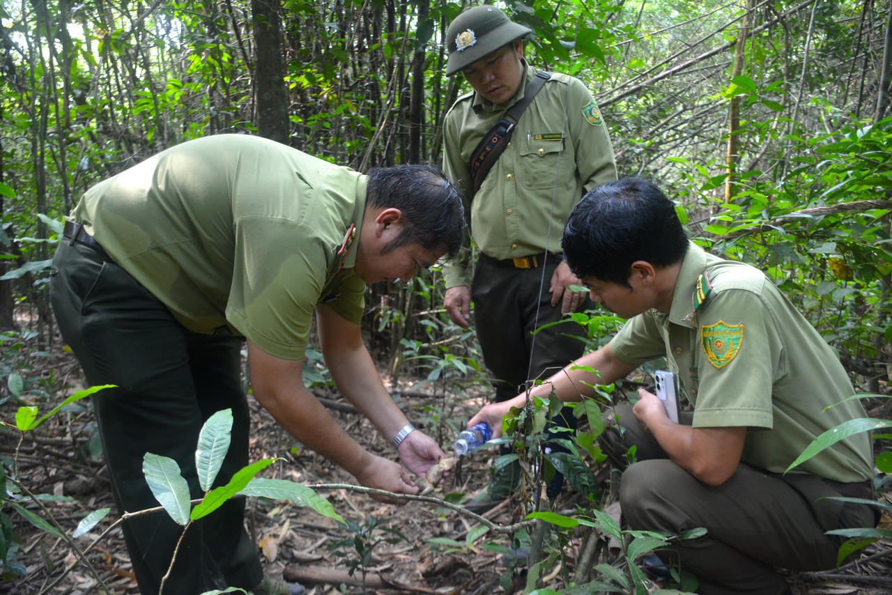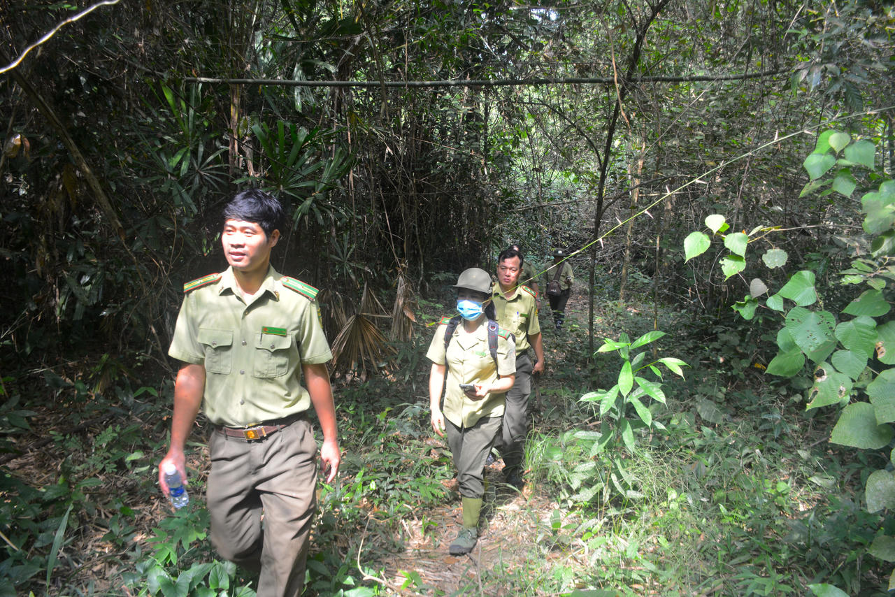 Nữ cán bộ kiểm lâm Lê Thị Vân cũng sát cánh cùng đồng nghiệp trong các chuyến tuần tra xuyên rừng, cùng nhau quan sát, sử dụng công nghệ và bản đồ số xác định các "điểm nóng" có nguy cơ cao bị xâm nhập để bảo vệ rừng hiệu quả hơn và cùng đánh giá thực trạng đa dạng sinh học tại hiện trường.