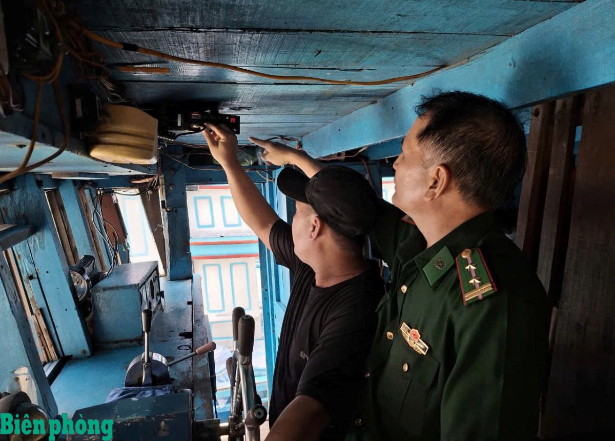Cán bộ Bộ đội Biên phòng tỉnh Khánh Hòa kiểm tra hệ thống thông tin trang bị trên tàu cá của ngư dân. Ảnh: Bích Nguyên