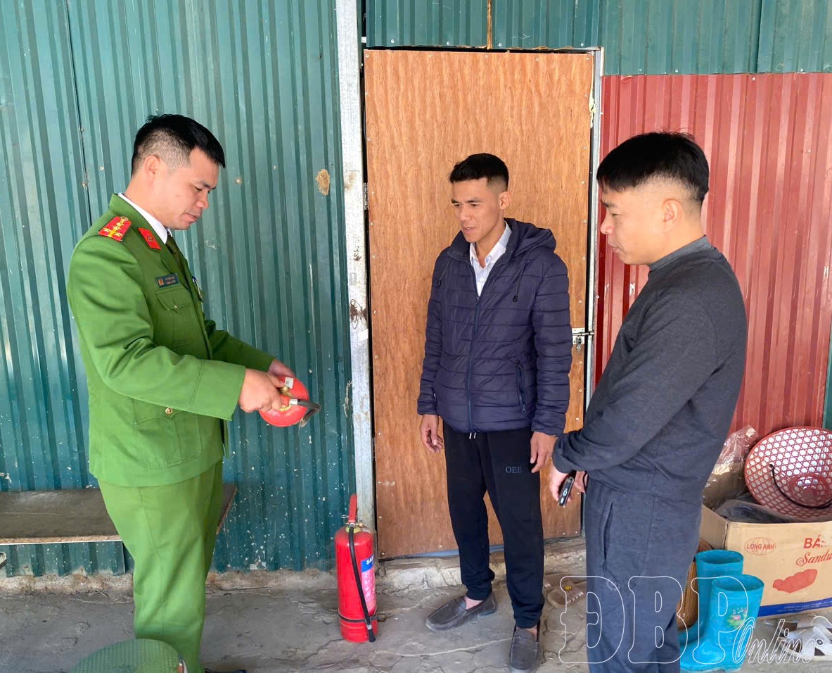 Cảnh sát PCCC hướng dẫn công nhân đang thi công tại Nhà máy Thủy điện Chiềng Sơ 2, xã Mường Luân sử dụng bình chữa cháy.