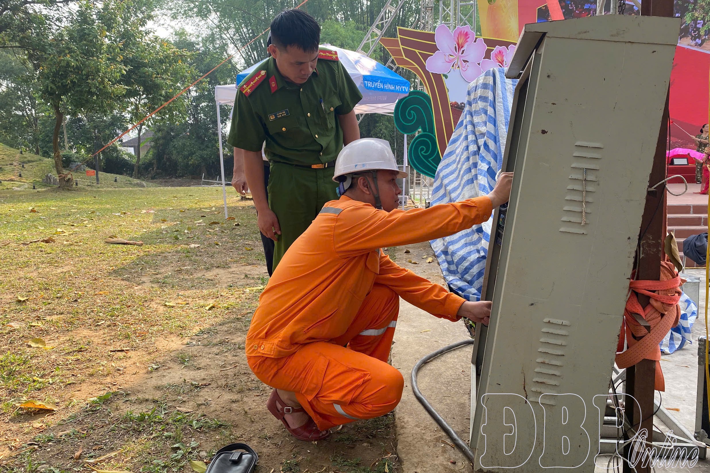 Cán bộ Cảnh sát PCCC kiểm tra an toàn hệ thống điện tại khu vực tổ chức Lễ hội Đền Hoàng Công Chất năm 2026.