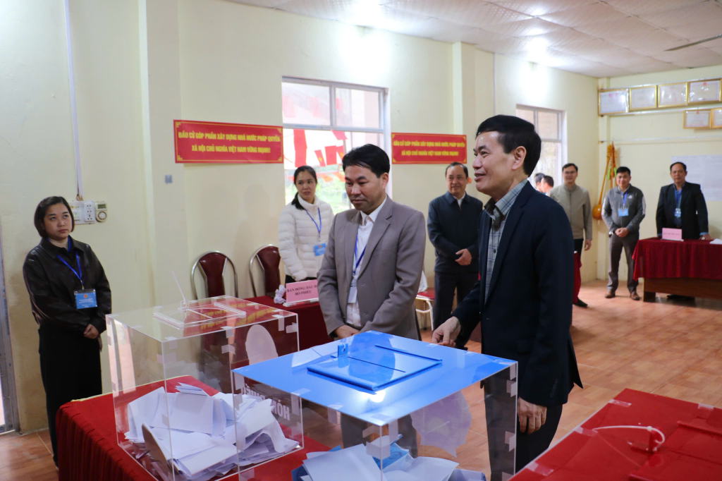 Giám đốc Báo và Phát thanh, Truyền hình tỉnh Sầm Việt An kiểm tra công tác bầu cử tại khu vực bỏ phiếu số 01, xã Trường Hà.
