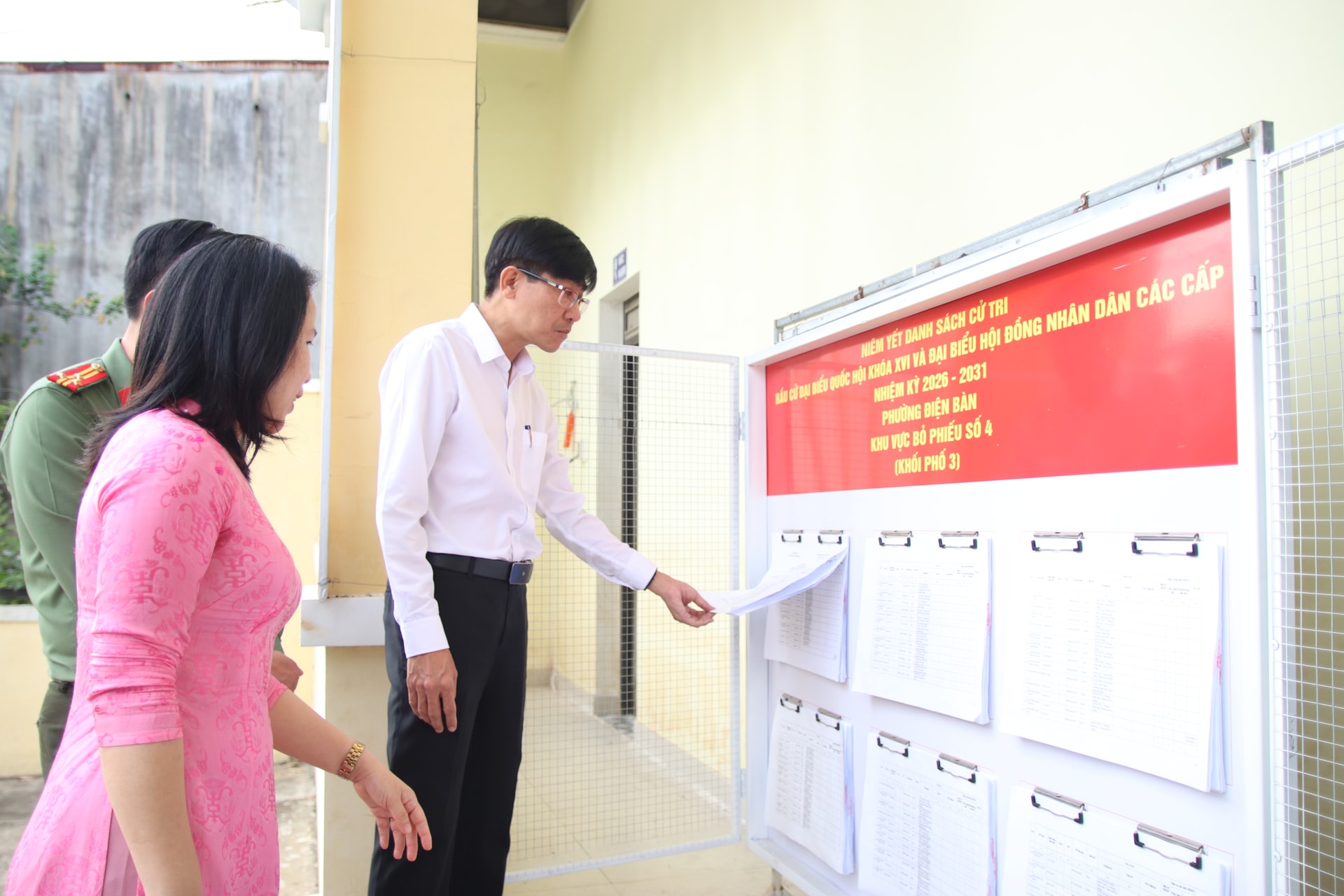Kiểm tra tại các điểm bỏ phiếu tại phường Điện Bàn, Chánh Thanh tra thành phố Trần Thắng Lợi kiểm tra việc niêm yết danh sách cử tri, danh sách và tiểu sử tóm tắt của các ứng cử viên đại biểu Quốc hội khóa XVI và đại biểu HĐND các cấp nhiệm kỳ 2026 - 2031; công tác trang trí trực quan.