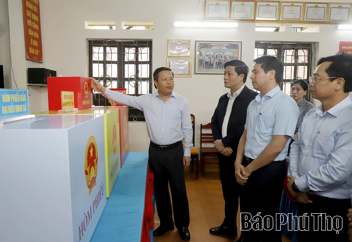 Đồng chí Phó Chủ tịch UBND tỉnh Phan Trọng Tấn kiểm tra việc chuẩn bị cho ngày bầu cử tại khu vực bỏ phiếu Khu 1 Sơn Vi, xã Phùng Nguyên.