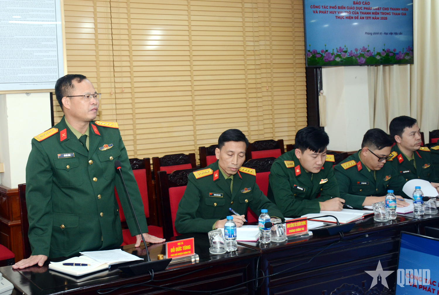 Đại tá Đỗ Đức Tùng báo cáo tóm tắt kết quả công tác phổ biến, giáo dục pháp luật cho thanh niên Học viện Hậu cần với đoàn kiểm tra.