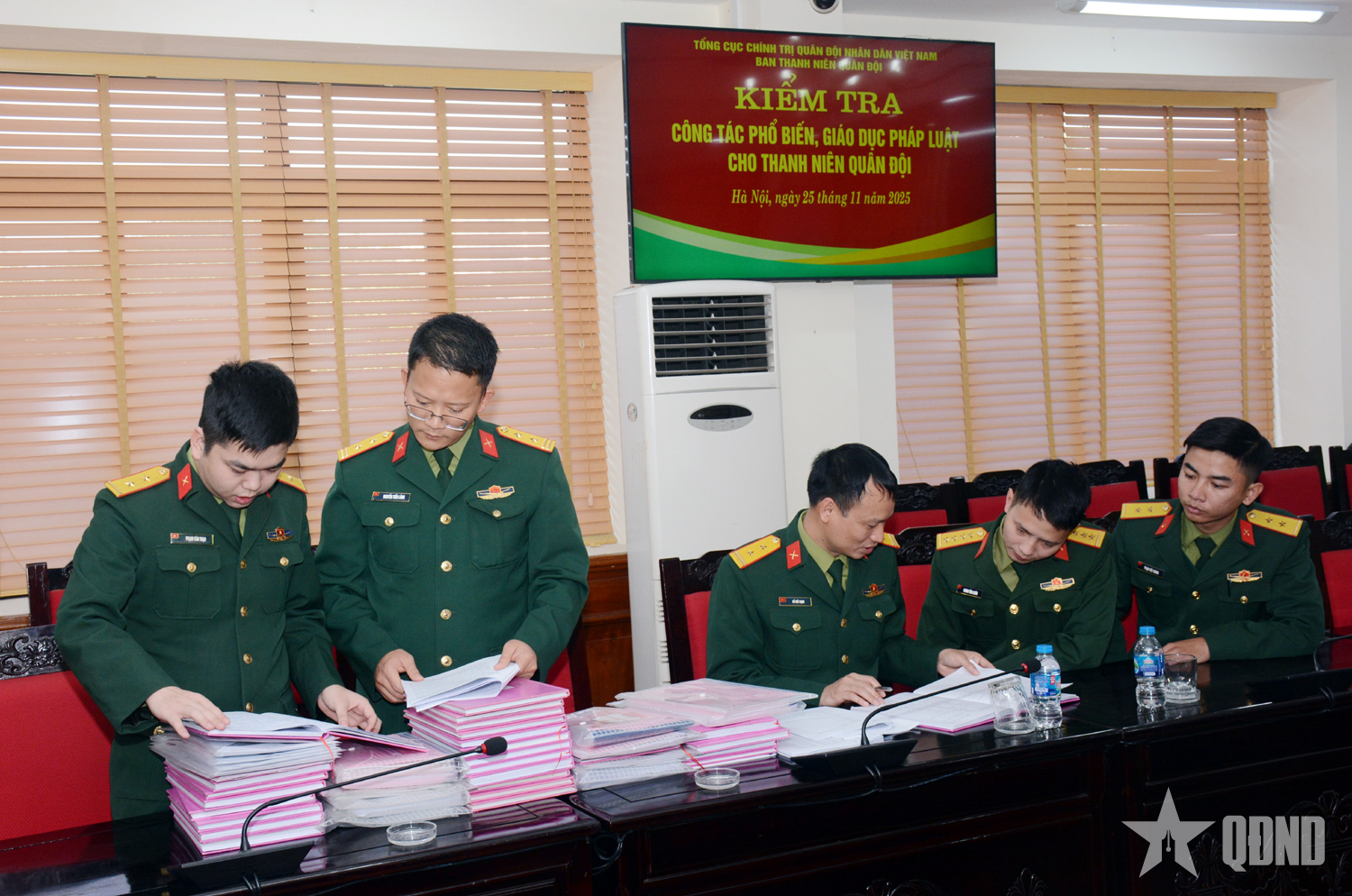 Cán bộ Ban Thanh niên Quân đội kiểm tra văn bản, sổ sách liên quan đến công tác phổ biến, giáo dục pháp luật cho thanh niên của các tổ chức Đoàn thuộc Học viện Hậu cần.