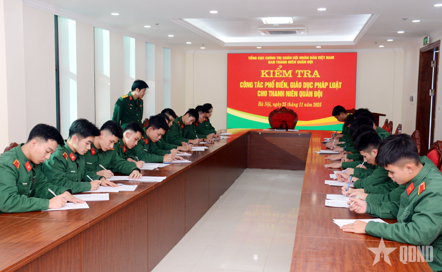 Đoàn công tác tổ chức kiểm tra nhận thức về pháp luật, kỷ luật cho đại diện thanh niên Học viện Hậu cần theo phương pháp tự luận.