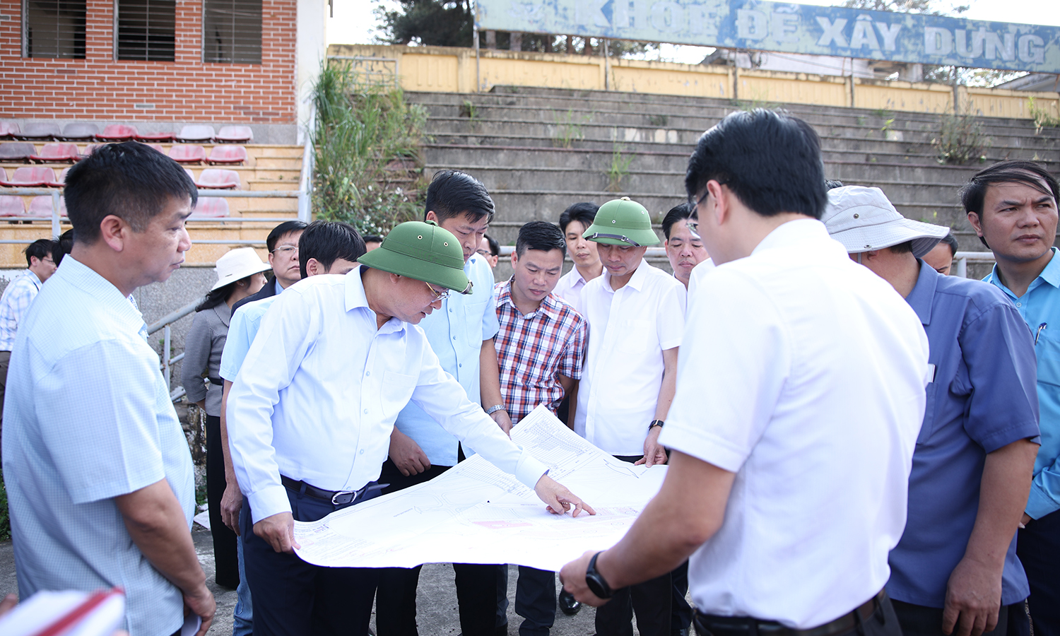 Bí thư Tỉnh ủy Lê Minh Ngân xem bản đồ quy hoạch Khu đất đấu giá Khu thương mại và nhà ở Lai Châu tổ 8, phường Đoàn Kết.