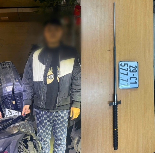 Quá trình kiểm tra phát hiện trong cốp xe máy của đối tượng có 01 gậy ba khúc bằng kim loại và 01 biển xe máy 29C1-577.77. Đối tượng khai nhận biển xe trên là giả do đối tượng đặt mua trên mạng.