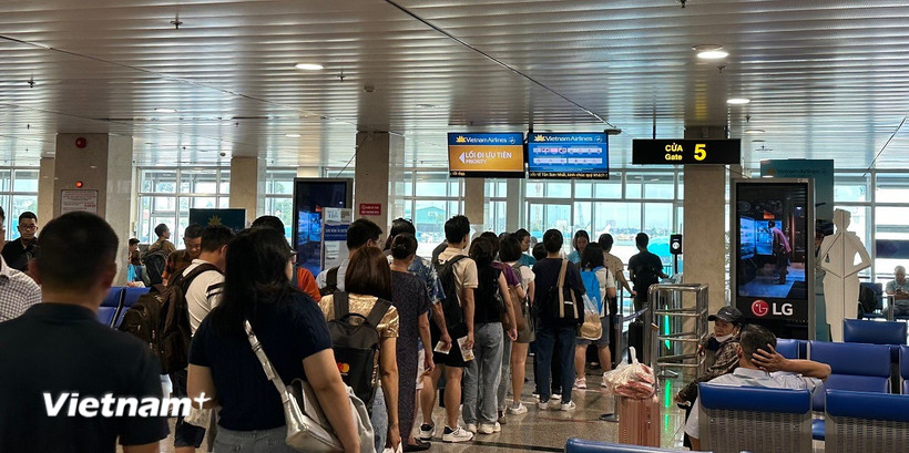 Hành khách làm thủ tục tại cửa lên máy bay tại một cảng hàng không. (Ảnh: Việt Hùng/Vietnam+)