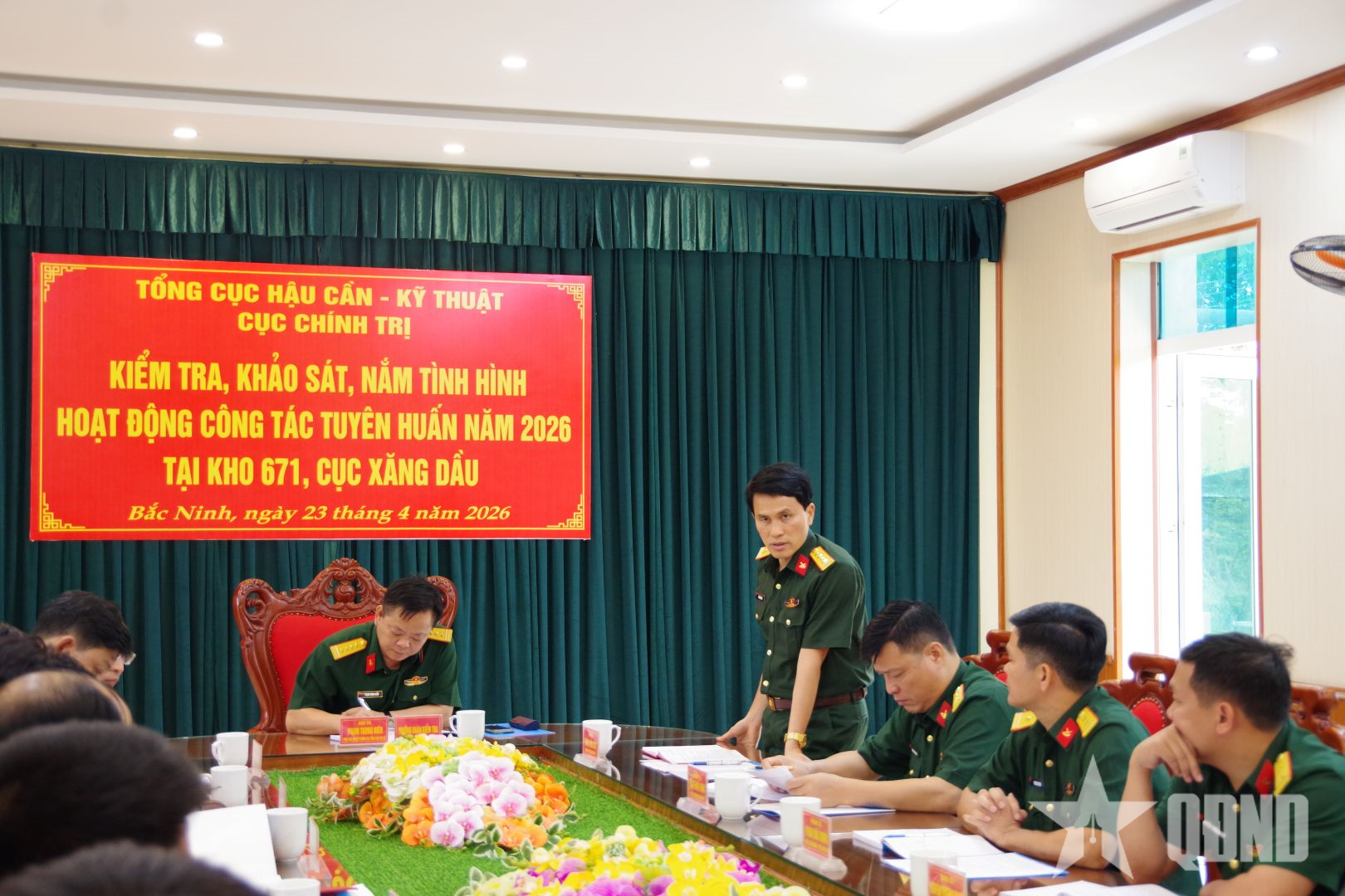 Tại buổi kiểm tra, Đại tá Trần Văn Duy, Bí thư Đảng ủy, Chính trị viên Kho 671, đã báo cáo với đoàn công tác về kết quả thực hiện công tác tuyên huấn trong những tháng đầu năm 2026.