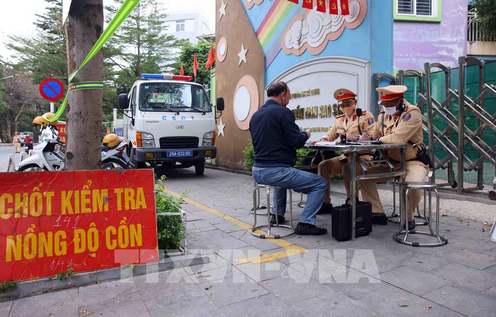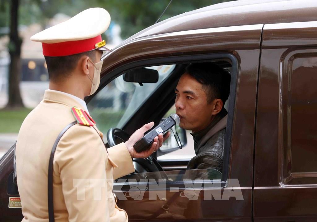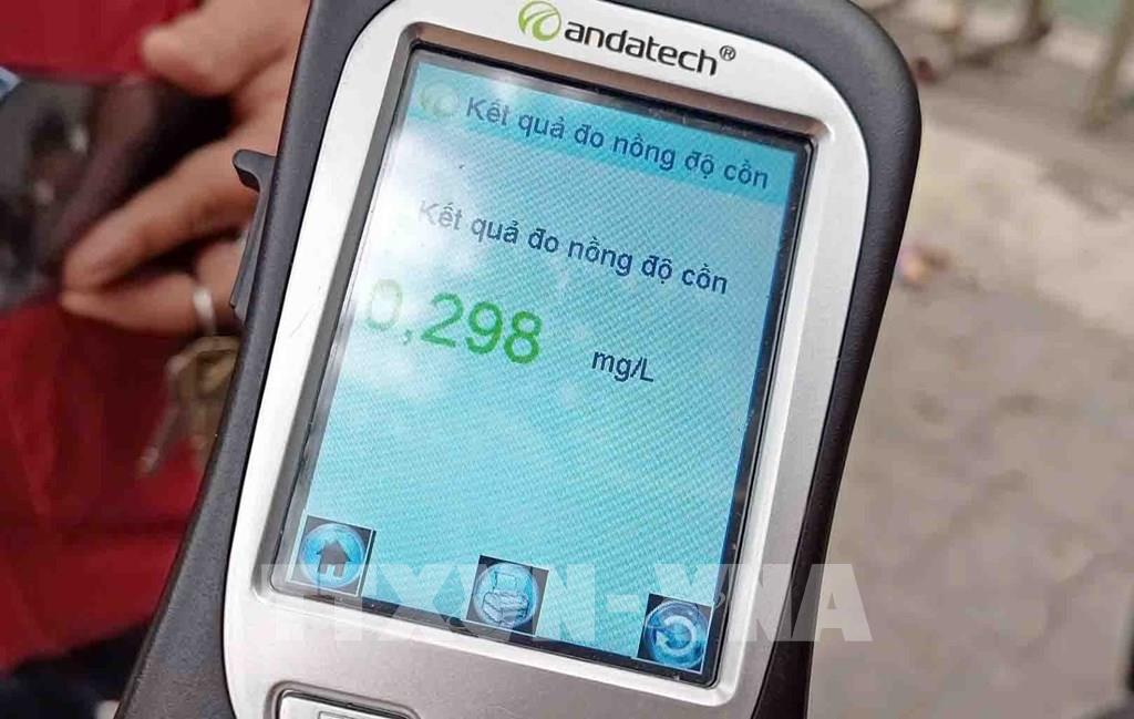 Chỉ sau ít phút lập chốt kiểm tra nồng độ cồn, lực lượng chức năng đã phát hiện một trường hợp vi phạm nồng độ cồn ở mức 0,298 mg/L khí thở . Ảnh: Phạm Kiên - TTXVN
