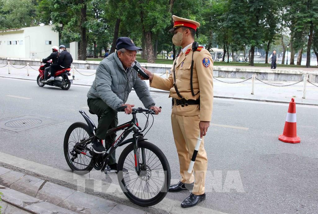 Một trường hợp đi xe đạp cũng được tổ công tác kiểm tra nồng độ cồn kiểm tra. Ảnh: Phạm Kiên - TTXVN