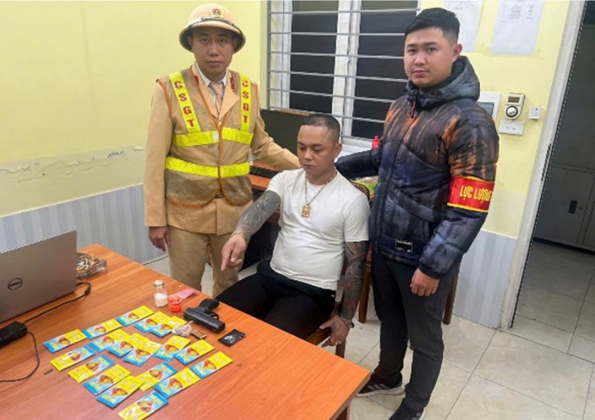Tiến hành dừng xe kiểm tra, lực lượng chức năng phát hiện trên phương tiện có 1 khẩu súng ngắn, 8 viên đạn và nhiều hộp, túi chứa tinh thể và viên nén nghi là ma túy. Cụ thể, là 1 hộp tròn chứa 37 viên nén màu hồng và tinh thể màu trắng; 2 hộp tròn và 1 hộp nhựa chứa tinh thể màu trắng; 1 túi nilon chứa chất bột màu đỏ; 1 túi nilon chứa tinh thể màu trắng; 18 túi nilon màu vàng, xanh nước biển chứa dung dịch dạng “nước vui”.