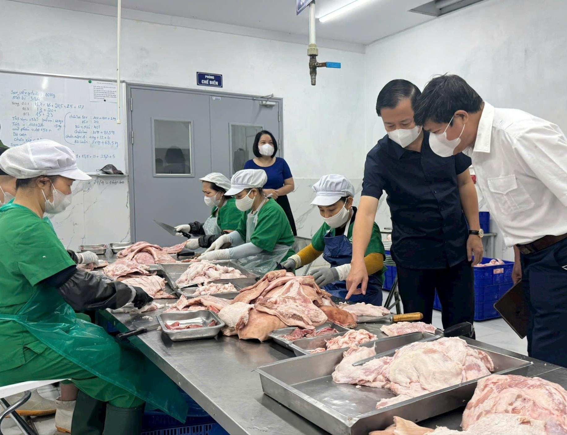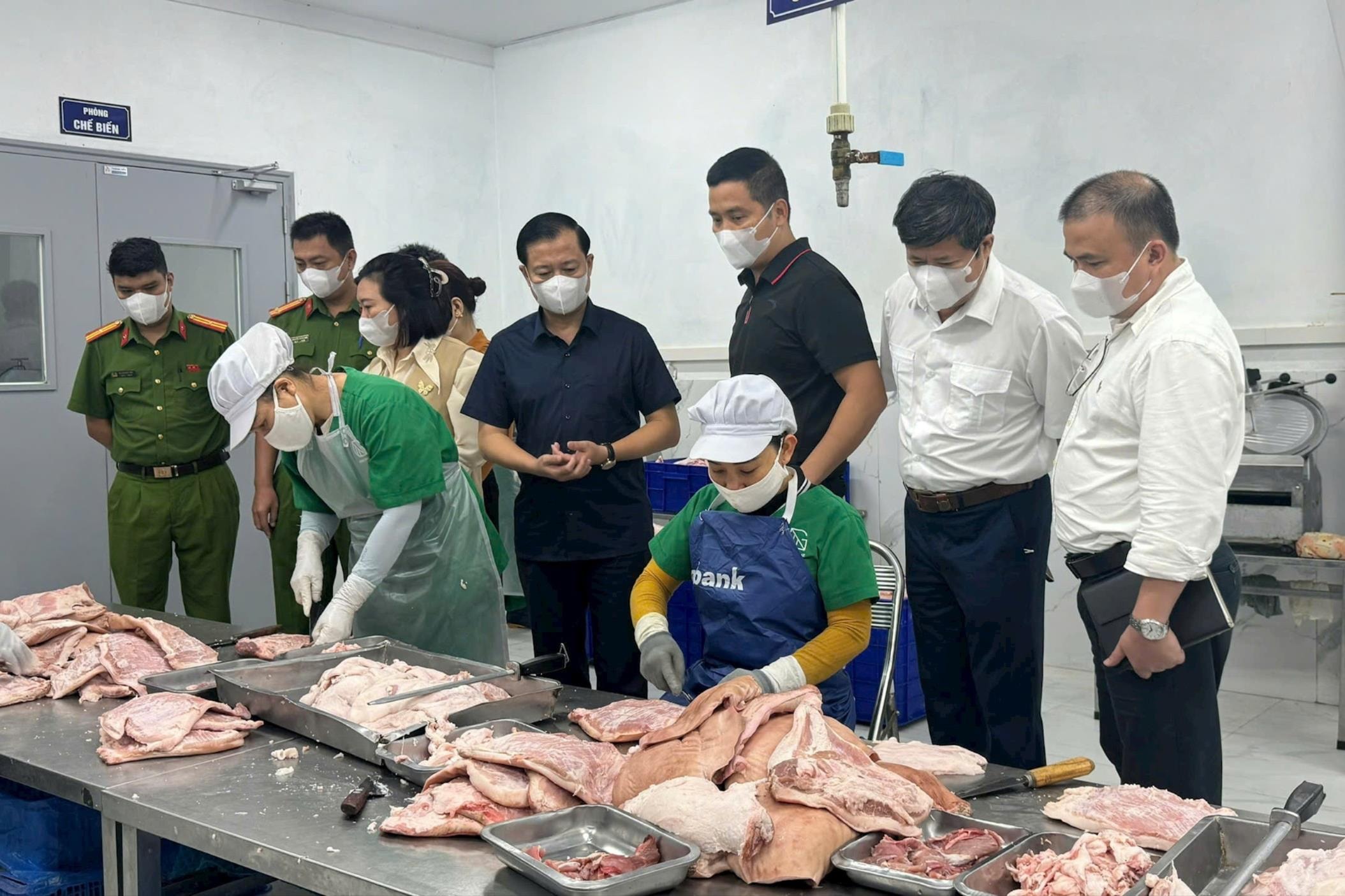 Các thành viên Đoàn kiểm tra liên ngành công tác an toàn thực phẩm số 01 của thành phố Hà Nội kiểm tra đột xuất tại khu vực chế biến của Công ty TNHH Xuất nhập khẩu và thương mại Green Exim. Ảnh: Mai Hoa