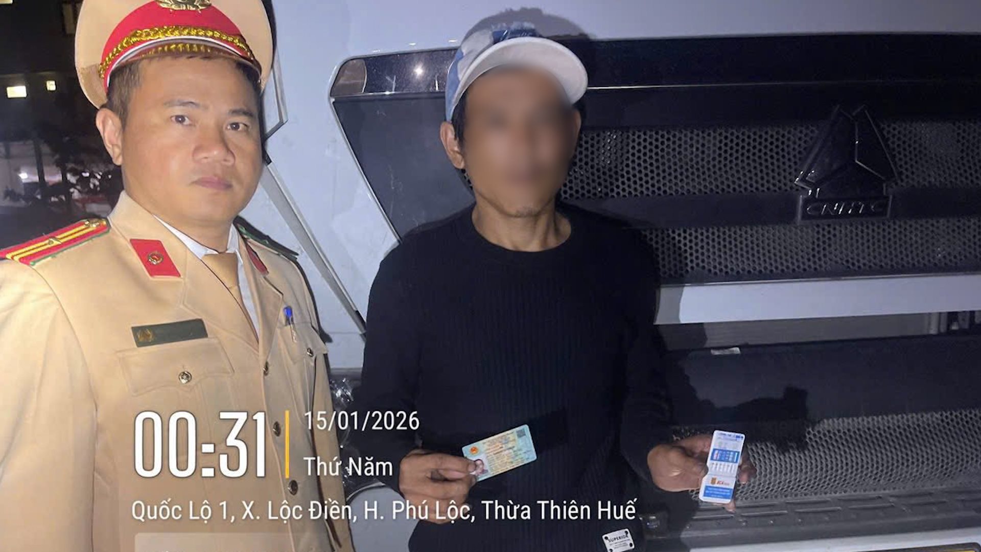Cụ thể, vào lúc 23 giờ ngày 14/01/2026, tại km 861 Quốc lộ 1, thuộc địa bàn phường Phú Lộc, TP. Huế, tổ công tác của Trạm Cảnh sát giao thông Phú Lộc (Phòng CSGT Công an TP. Huế) tiến hành kiểm tra phương tiện kinh doanh vận tải lưu thông trên tuyến.