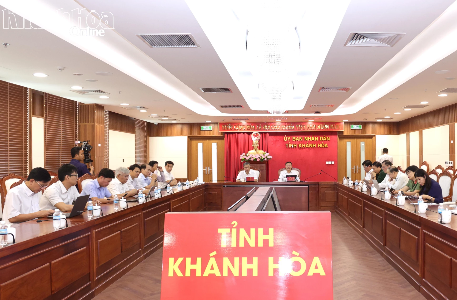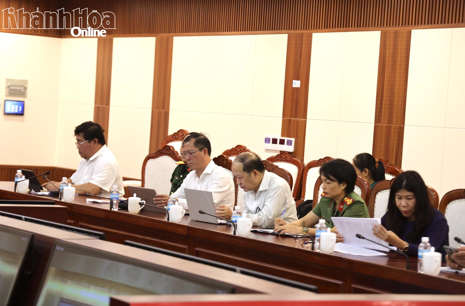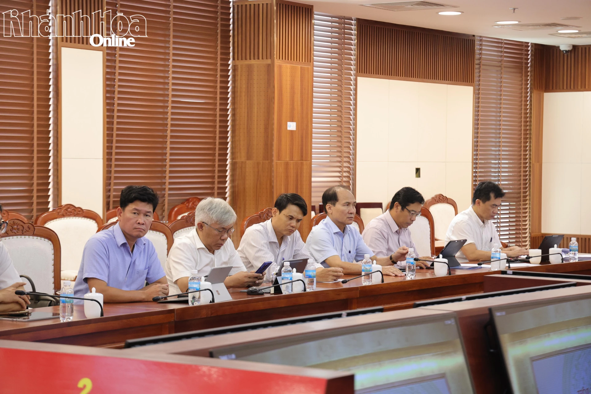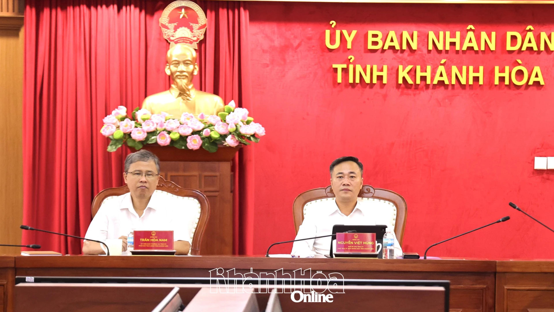 Chủ tịch UBND tỉnh Nguyễn Việt Hùng và Phó Chủ tịch UBND tỉnh Trần Hòa Nam tại điểm cầu tỉnh Khánh Hòa.