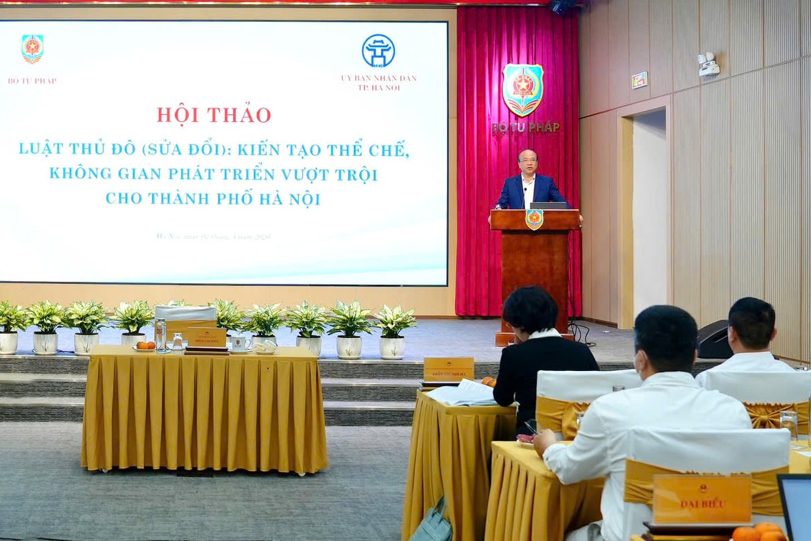 Phát biểu khai mạc Hội thảo, Thứ trưởng Bộ Tư pháp Phan Chí Hiếu nhấn mạnh, trong thời gian qua, Đảng và Nhà nước ta đã có nhiều văn bản chỉ đạo quan trọng về xây dựng và phát triển Thủ đô, gần đây nhất là Nghị quyết số 02-NQ/TW ngày 17/3/2026 của Bộ Chính trị về xây dựng và phát triển Thủ đô Hà Nội trong kỷ nguyên mới. Theo đó, Nghị quyết đã nâng tầm mục tiêu phát triển Thủ đô với tầm nhìn dài hạn 100 năm, định hướng Thủ đô không phải chỉ là trung tâm chính trị - hành chính quốc gia, trái tim của cả nước mà còn phải trở thành thành phố toàn cầu, thuộc nhóm các thủ đô có chất lượng sống và chỉ số hạnh phúc cao nhất thế giới vào năm 2065.