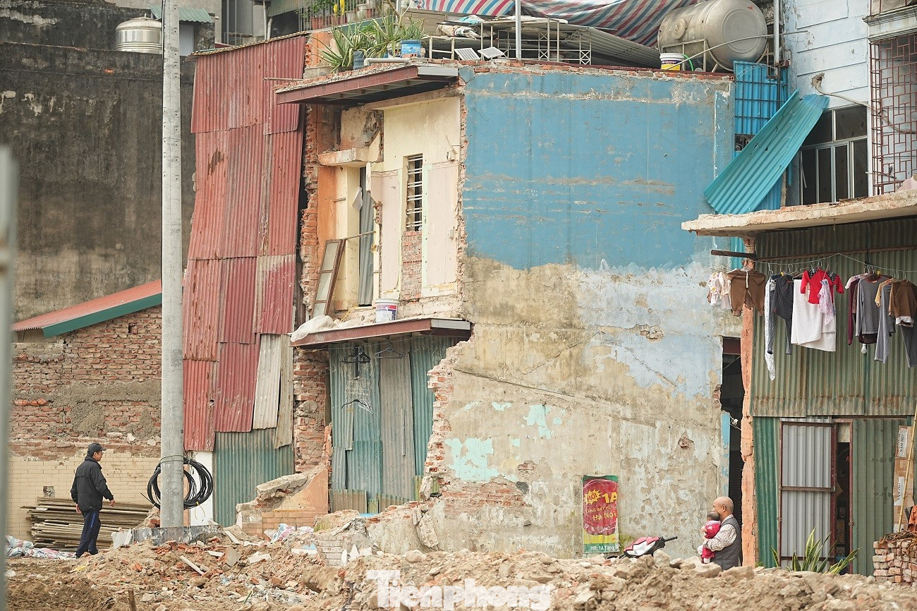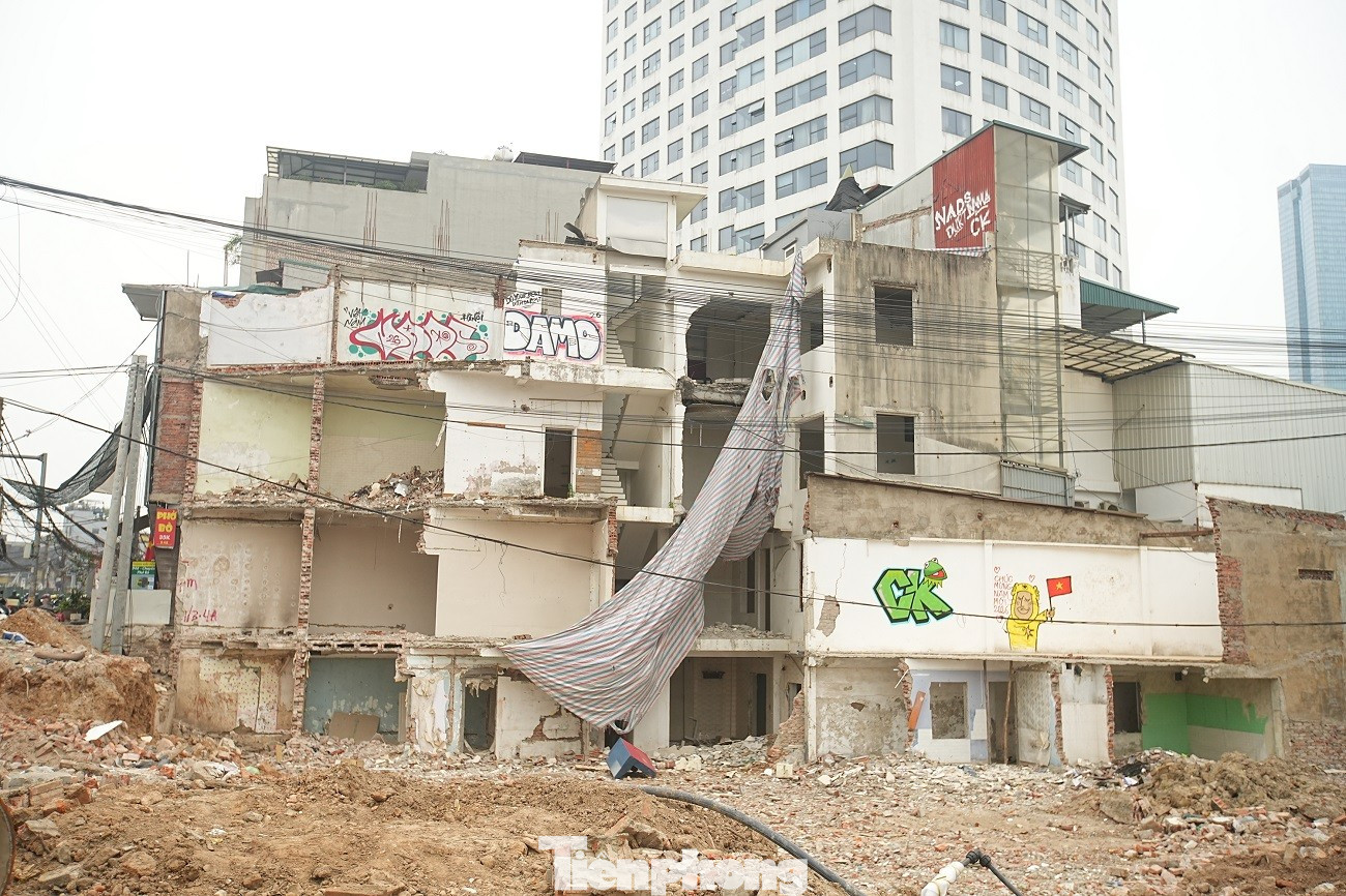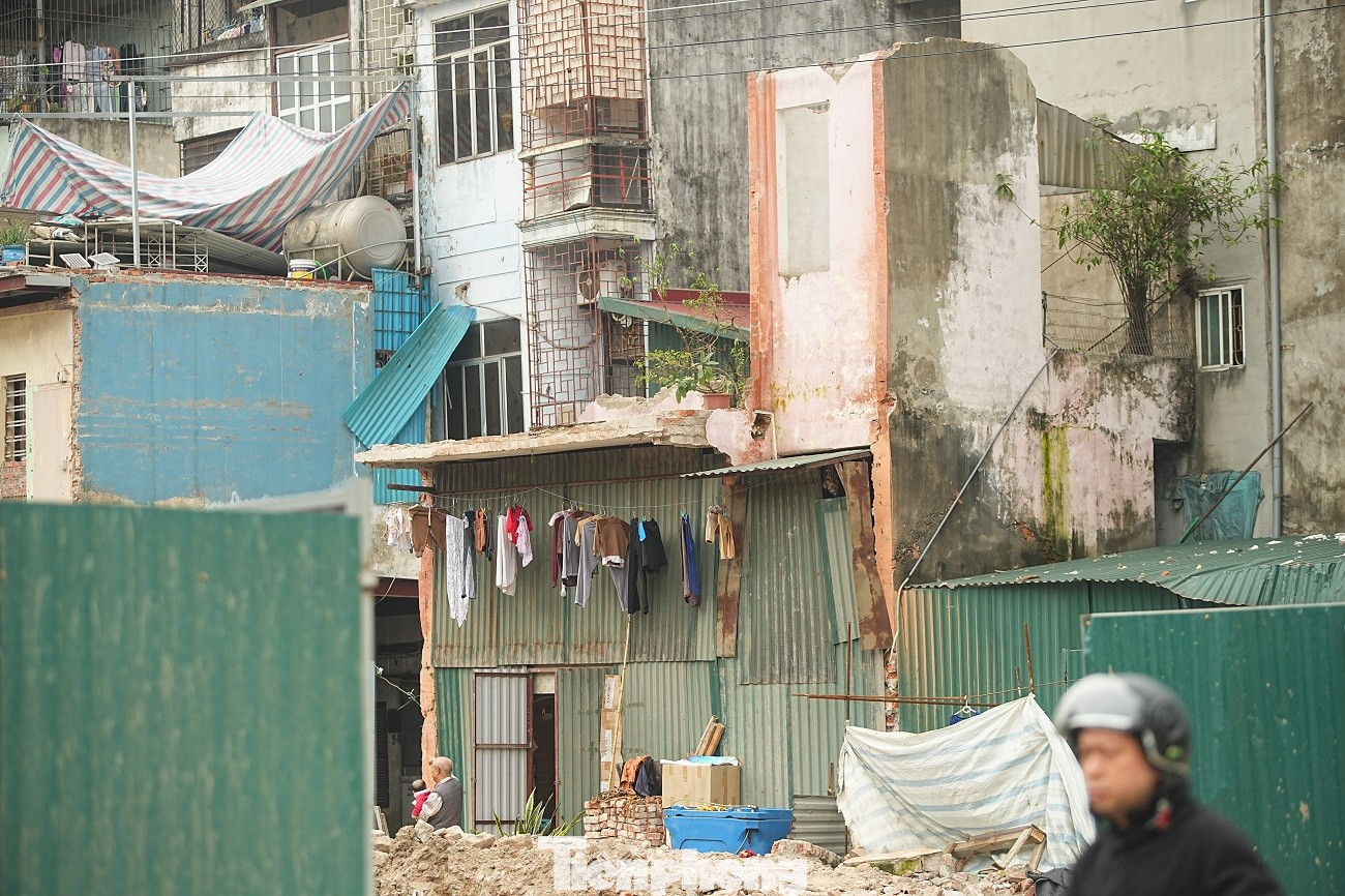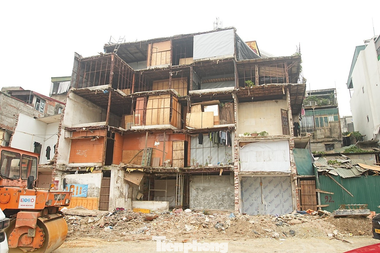 Việc giải phóng mặt bằng làm lộ ra những dãy nhà cũ thuộc khu tập thể Thành Công nằm sát ngay mặt đường lớn.