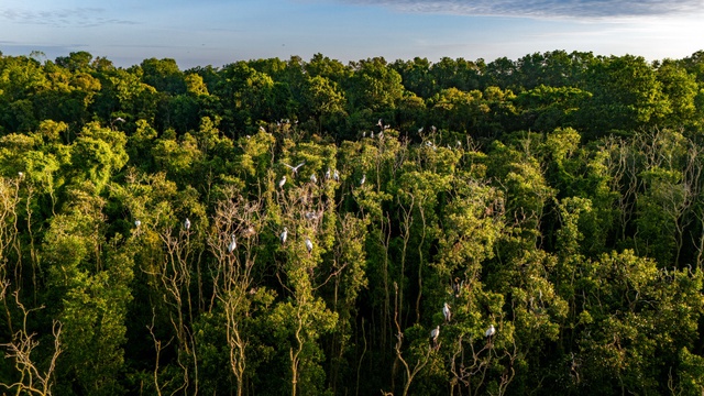 Đỉnh cao nhất của "thành phố" chính là tán rừng, mái nhà chung của "giới thượng lưu" hoang dã. Tại đây, những đàn cò trắng, diệc xám, già đẫy Java hay sếu đầu đỏ thiết lập những "vọng gác"của riêng mình.