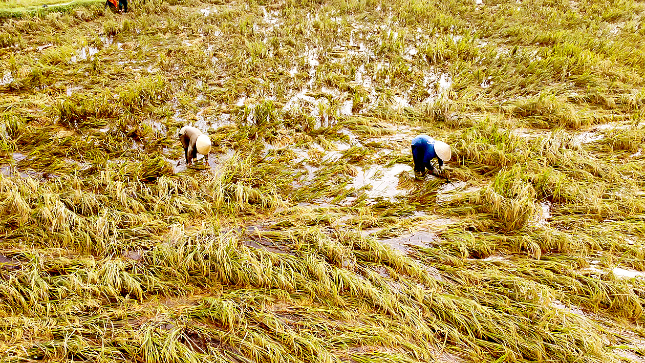 Người dân xã Đông Tiến (tỉnh Thanh Hóa) vớt vát lúa đổ sau bão lũ