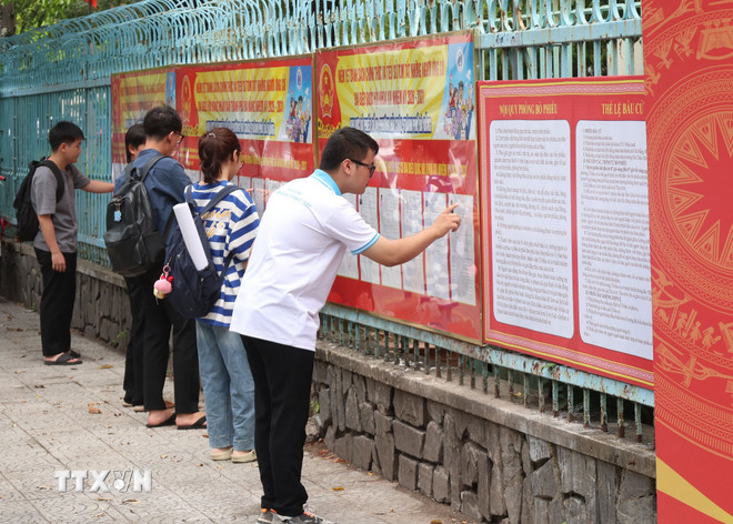Thanh niên, cử tri trẻ tại thành phố Đà Nẵng quan tâm, tìm hiểu các thông tin về bầu cử. (Ảnh: Khoa Chương/TTXVN)