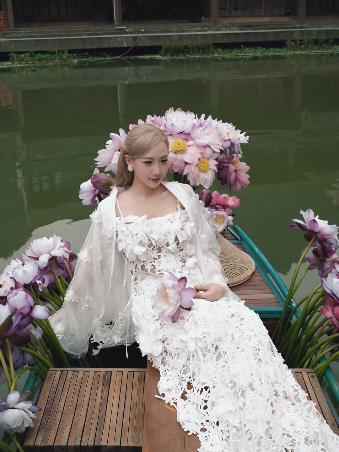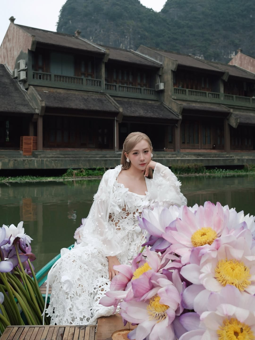 Ngồi trên con thuyền nhỏ chở đầy những đóa hoa sen khổng lồ với sắc tím hồng dịu nhẹ, cô nàng trông thật nổi bật giữa phông nền trầm mặc của những nếp nhà cổ và vách núi rêu phong. (Ảnh: IGNV)