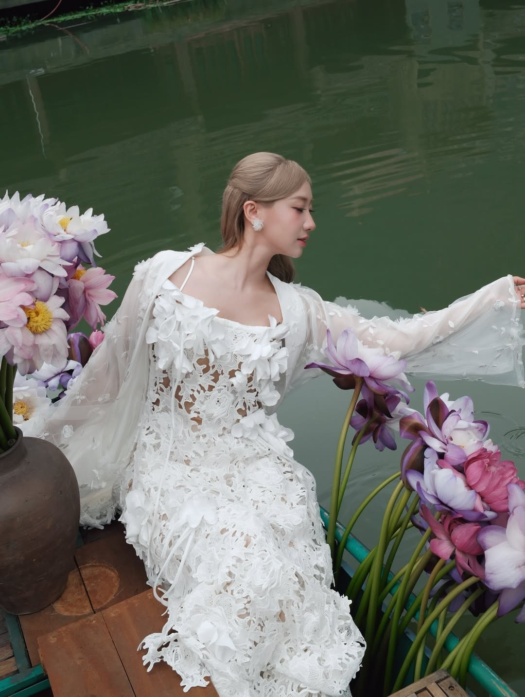 Cô diện bộ váy ren trắng tinh khôi với các họa tiết hoa 3D nổi bật, kết hợp cùng áo khoác voan mỏng manh, tạo nên tổng thể vừa quyến rũ, vừa kín đáo, sang trọng. (Ảnh: IGNV)