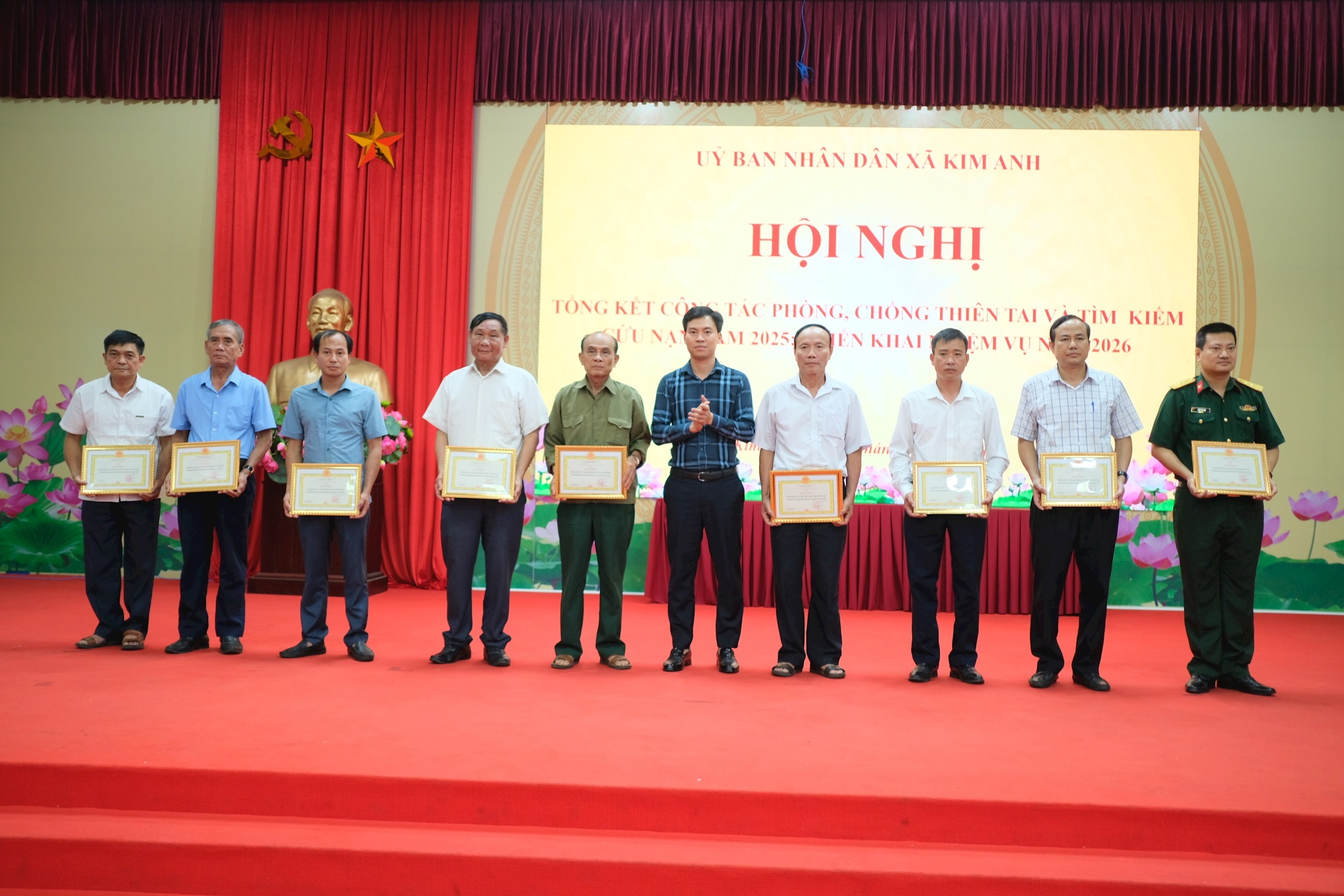 Phó Chủ tịch UBND xã Kim Anh Đoàn Hiệp trao tặng giấy khen cho các tổ chức cá nhân có thành tích trong triển khai nhiệm vụ phòng chống thiên tai, tìm kiếm cứu nạn tại địa bàn xã năm 2025. Ảnh: Sỹ Hào