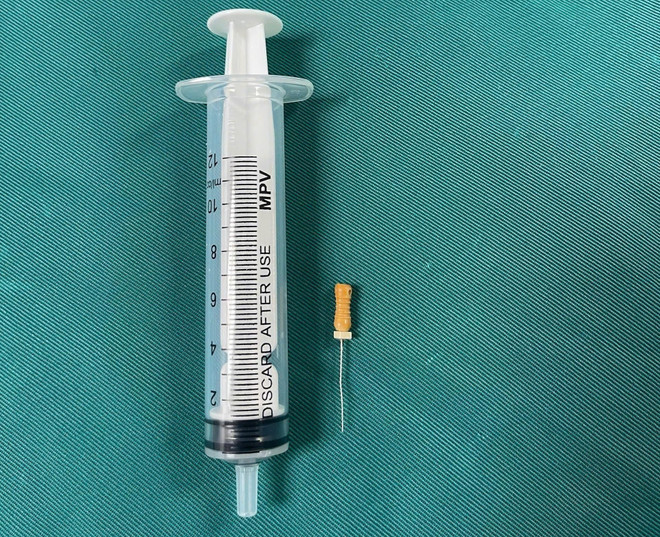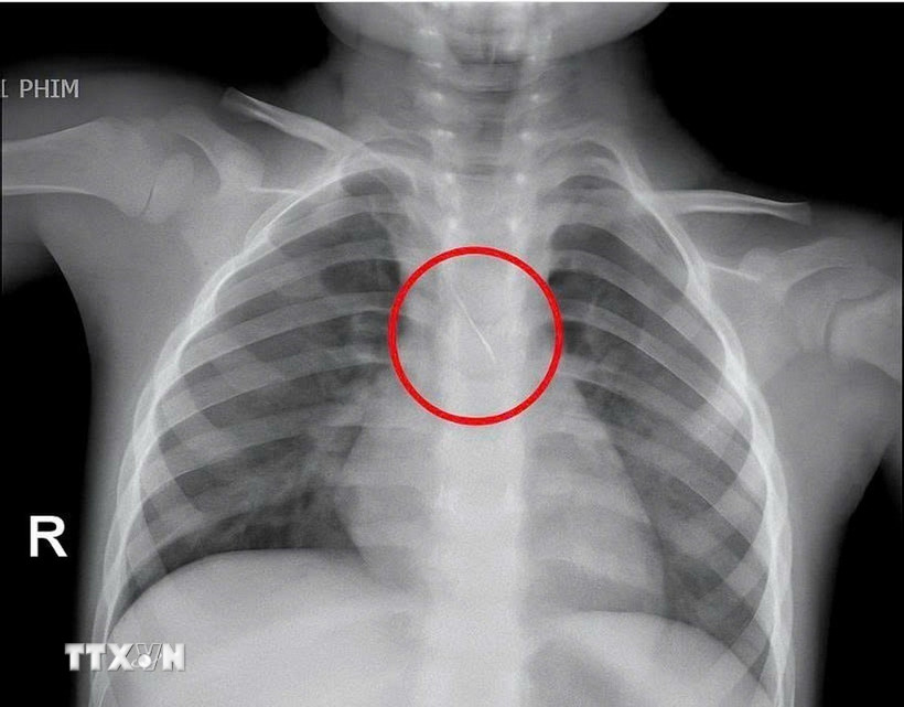 Hình ảnh chiếc kim chọc tủy rơi vào trong đường thở của bé trai 3 tuổi. (Ảnh: TTXVN phát)