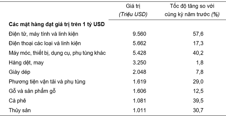 Trong tháng 1/2026 có 9 mặt hàng đạt kim ngạch xuất khẩu hơn 1 tỷ USD, chiếm 72,4% tổng kim ngạch xuất khẩu.