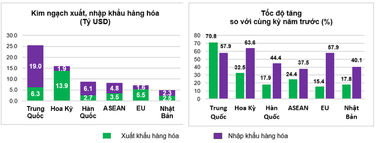 Hoa Kỳ tiếp tục là thị trường xuất khẩu lớn nhất của Việt Nam với kim ngạch đạt 13,9 tỷ USD. Trung Quốc là thị trường nhập khẩu lớn nhất của Việt Nam với kim ngạch đạt 19,0 tỷ USD.