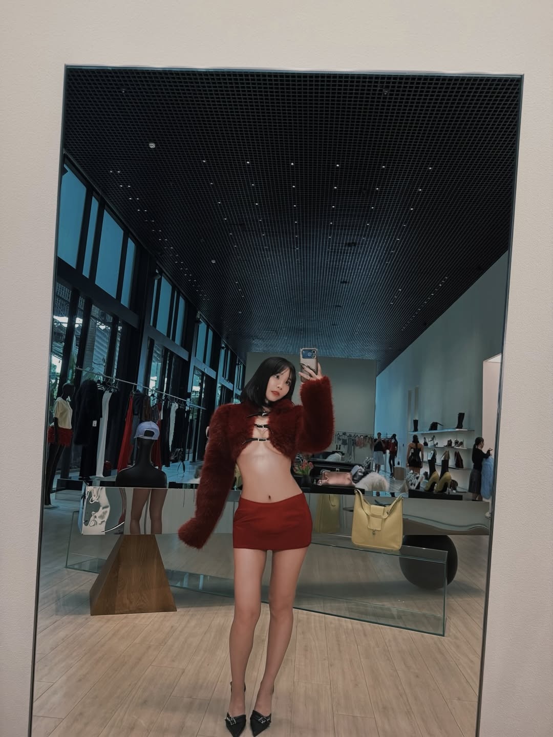 Trong các bức ảnh đăng tải, Kimberley Chen diện áo croptop dài tay chất liệu lông màu đỏ rượu vang, kết hợp cùng váy ngắn đồng màu và giày cao gót mũi nhọn màu đen, tôn lên đường cong cơ thể.