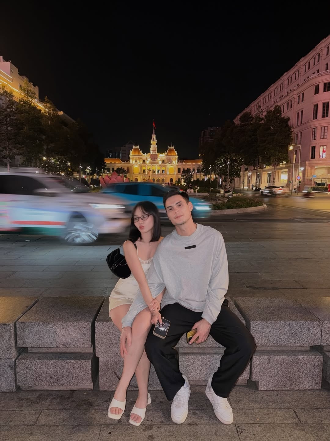Bên cạnh những bức ảnh thời trang, Kimberley Chen cũng chia sẻ khoảnh khắc đời thường trong chuyến du lịch cùng bạn trai. Trong một bức ảnh chụp vào buổi tối trên phố, cô mặc bộ jumpsuit hai dây hở lưng màu sáng, nắm tay bạn trai dạo bước. Ở một khoảnh khắc khác, cả hai ngồi cạnh nhau trên ghế đá ven đường, nữ ca sĩ tựa sát vào người yêu.