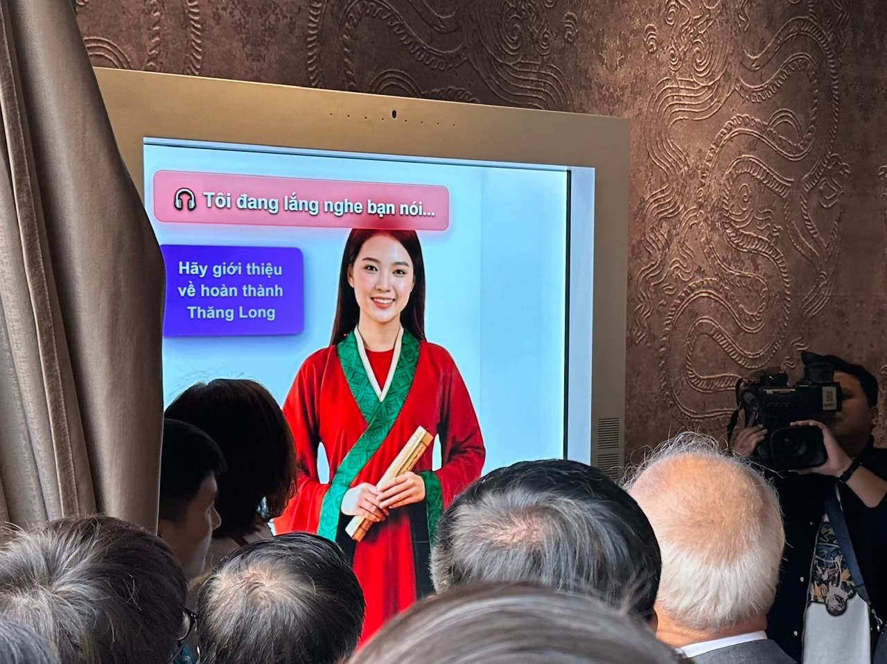 Khu lễ tân ảo AI đóng vai trò như một hướng dẫn viên lịch sử thông minh, ứng dụng trí tuệ nhân tạo kết hợp công nghệ nhận diện và cảm biến chuyển động. Hệ thống có khả năng tương tác trực tiếp, trả lời các câu hỏi của khách tham quan về triều Lý và lịch sử Việt Nam bằng giọng nói tự nhiên, kèm hình ảnh minh họa sinh động, tạo nên hình thức tiếp cận kiến thức hiện đại, hấp dẫn.