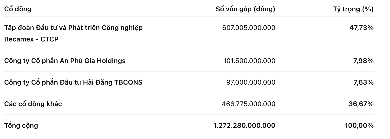 Thêm nữa, sau đợt tăng vốn, tỷ lệ sở hữu của Tập đoàn Đầu tư và Phát triển Công nghiệp Becamex – CTCP (Becamex IDC, mã BCM – sàn HOSE) đã giảm sở hữu từ 60,7%, về 47,73% vốn điều lệ. Ngoài ra, Công ty cũng có thêm hai cổ đông lớn mới là CTCP An Phú Gia Holdings sở hữu 7,98% vốn điều lệ; CTCP Đầu tư Hải Đăng TBCONS đang sở hữu 7,63% vốn điều lệ và còn lại 36,67% vốn điều lệ thuộc về các cổ đông khác.