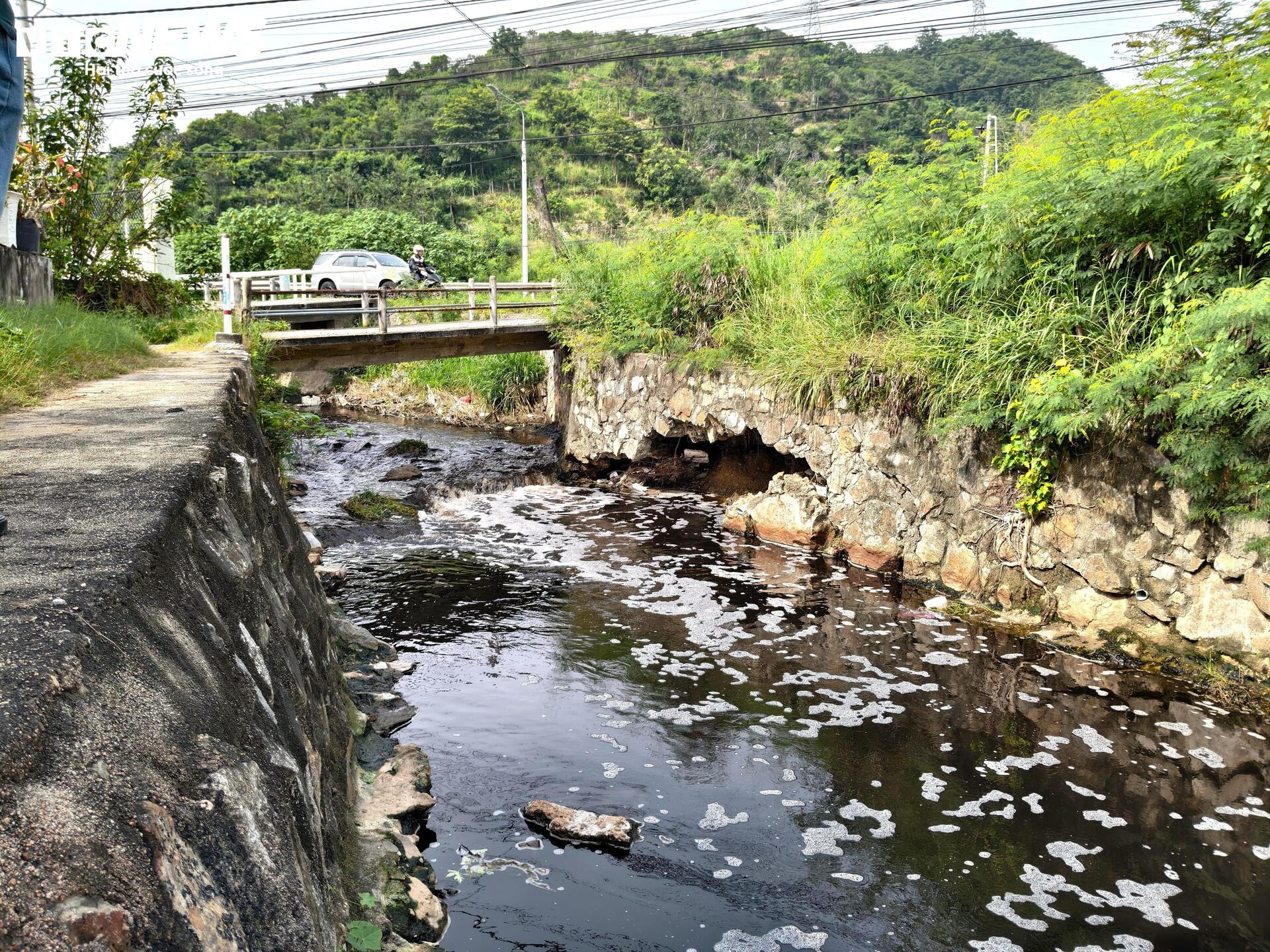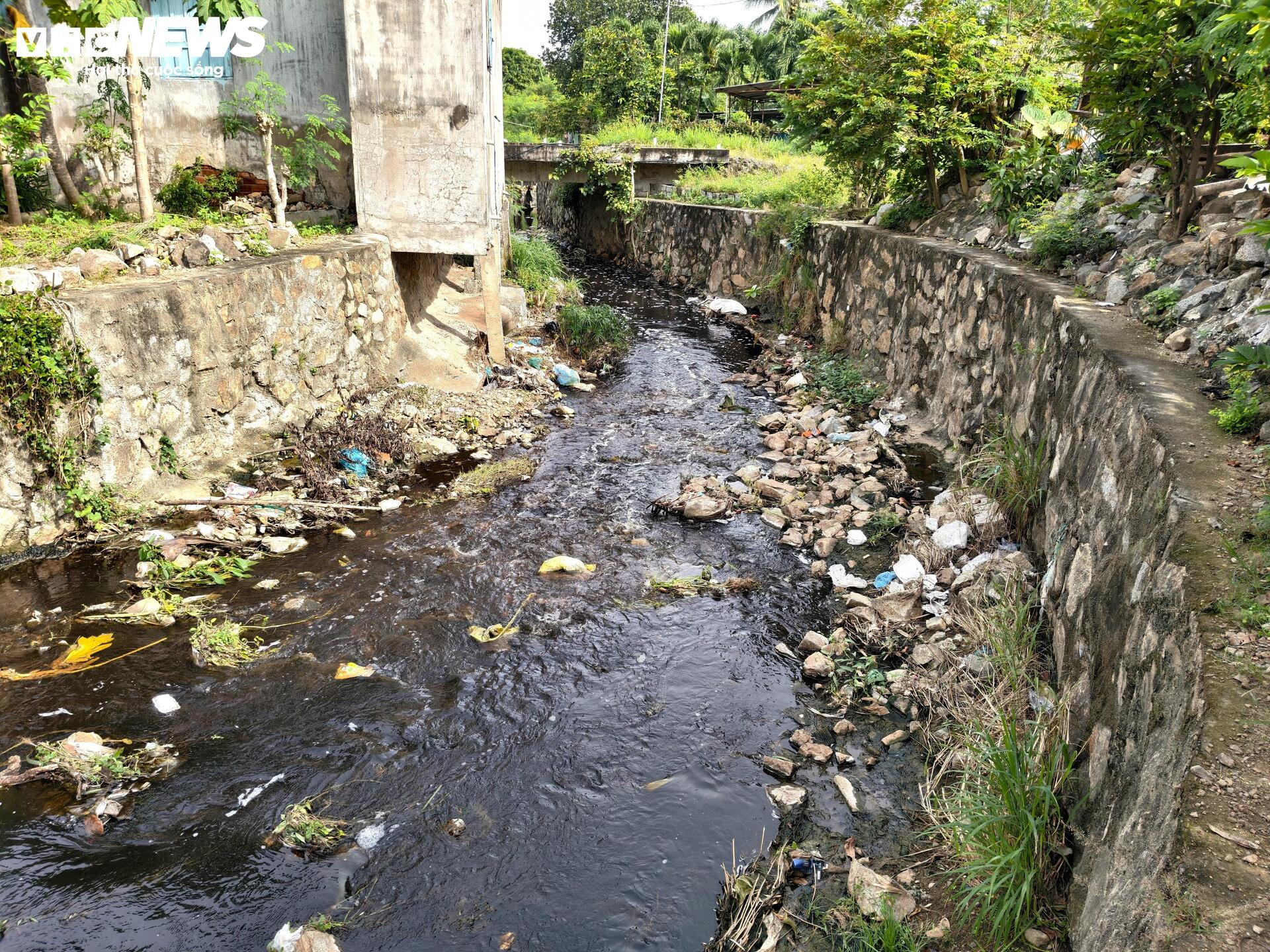 Dòng nước thải đen ngòm từ bãi rác chảy theo suối qua khu dân cư.