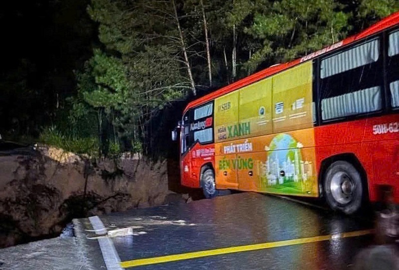 Thời điểm xảy ra sạt lở đúng lúc chiếc xe khách của Công ty Phương Trang chạy qua, khiến bánh trước sụp xuống mép hố, suýt rơi xuống vực sâu.