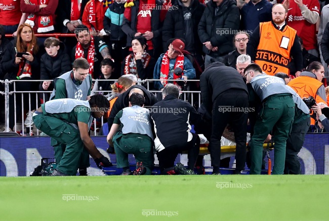 Các nhân viên ý tế trên sân Anfield đưa ngôi sao của Galatasaray đi cấp cứu. Ảnh: EPA.
