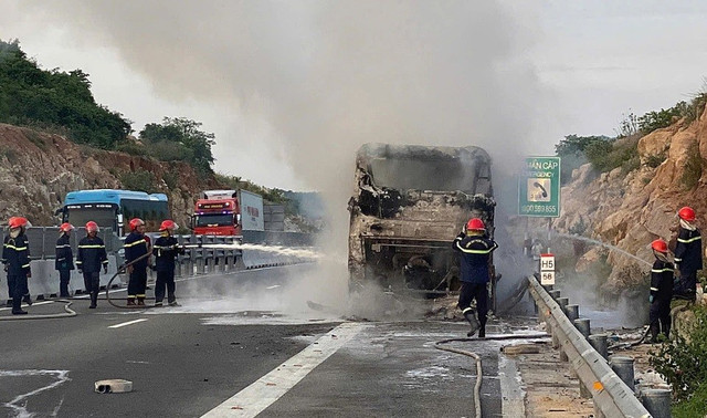 Nhận tin báo, lực lượng Cảnh sát giao thông phối hợp cùng Phòng cháy chữa cháy và cứu nạn cứu hộ tỉnh Khánh Hòa đã có mặt, dập tắt đám cháy và điều tiết giao thông.