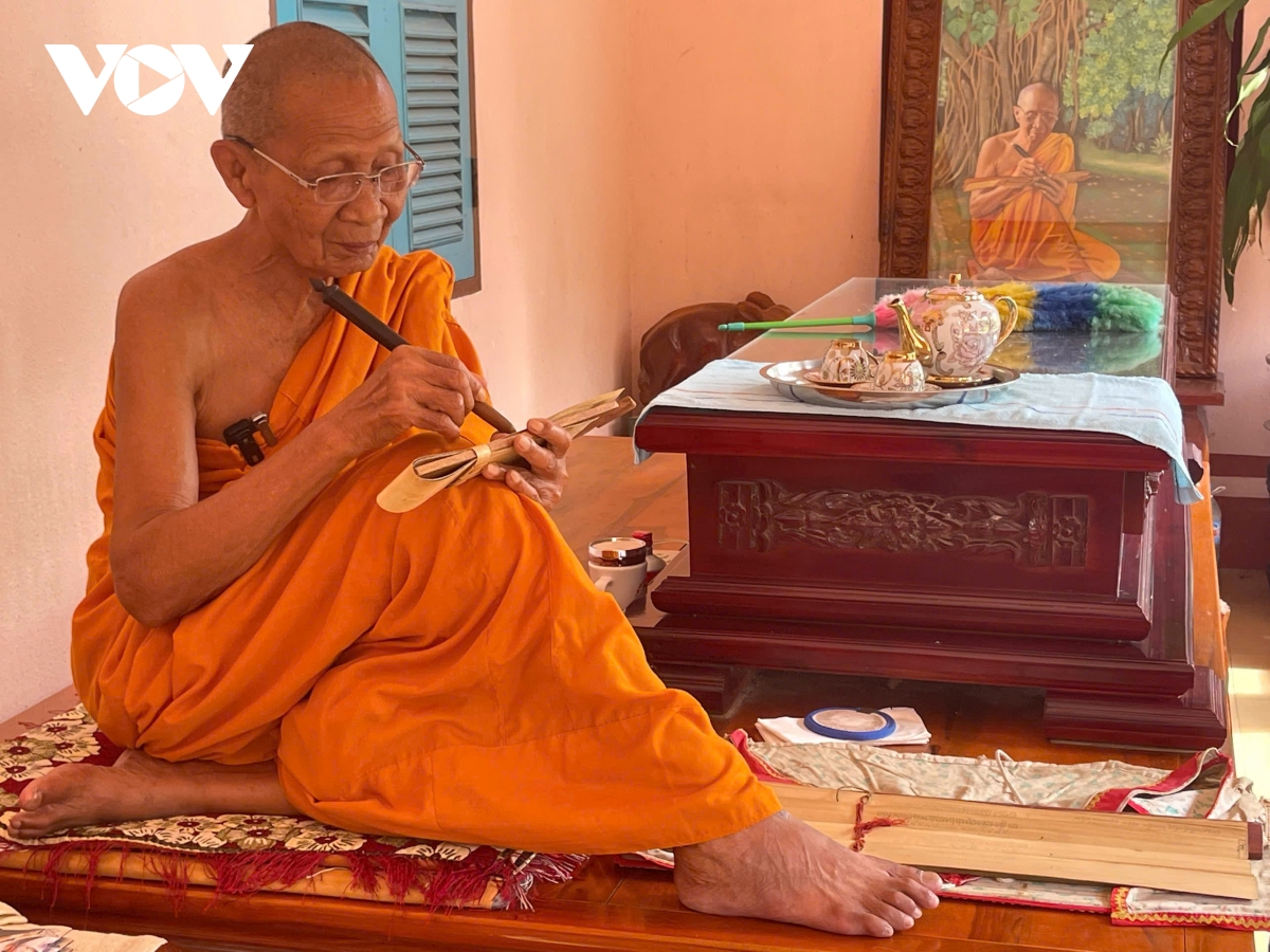 "Khắc kinh lá buông là một quá trình công phu, hoàn toàn khác với cách viết chữ thông thường. Từ tư thế ngồi, cách cầm bút khắc đến từng nét chữ đầu tiên, đều đòi hỏi sự chính xác và tỉ mỉ. Chỉ cần sơ ý là lá bị rách, phải làm lại từ đầu. Sau khi khắc, chữ không hiện màu ngay mà chỉ để lại dấu khắc trên lá. Người làm kinh phải trải qua nhiều công đoạn xử lý tiếp theo thì những dòng chữ mới hiện rõ. Người thợ dùng vải thấm mực - hỗn hợp bột than củi nghiền mịn trộn với dầu thông, dầu lửa - quét lên mặt lá rồi lau sạch. Khi đó, các nét chữ khắc mới dần hiện rõ và rất khó bị phai mờ. Đây là một cái nét đặc sắc của đồng bào Khmer mà không phải ai muốn học cũng học được", Hòa thượng Chau Ty chia sẻ những trăn trở.
