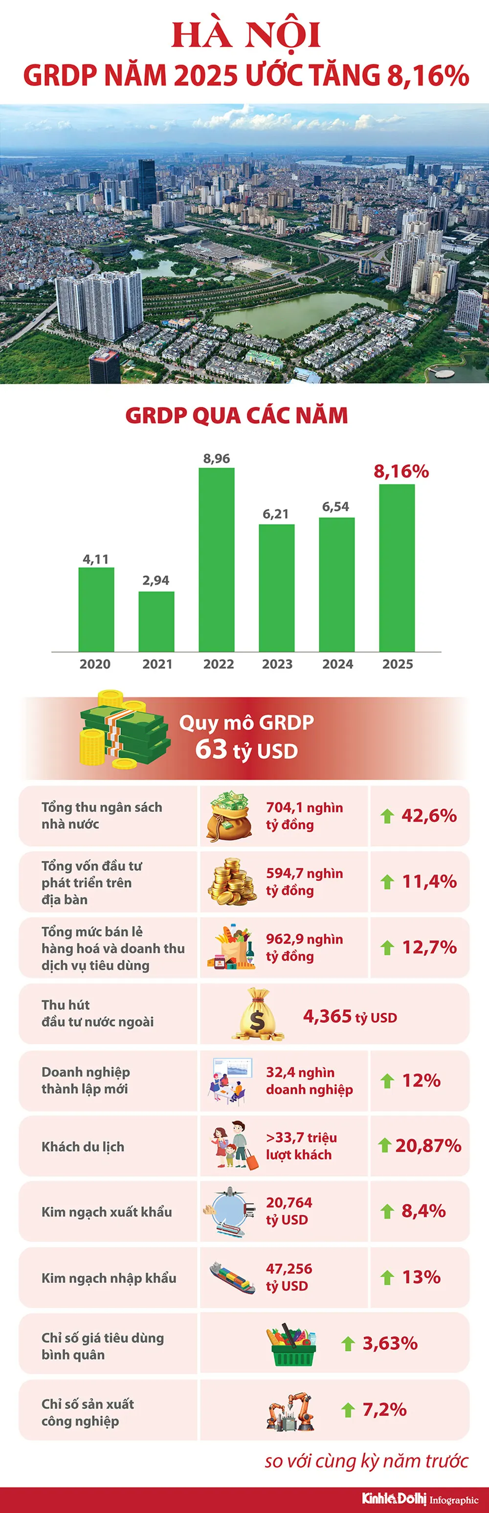 Kinh tế Hà Nội năm 2025 tăng trưởng ấn tượng, GRDP tăng 8,16%, quy mô đạt 63 tỷ USD