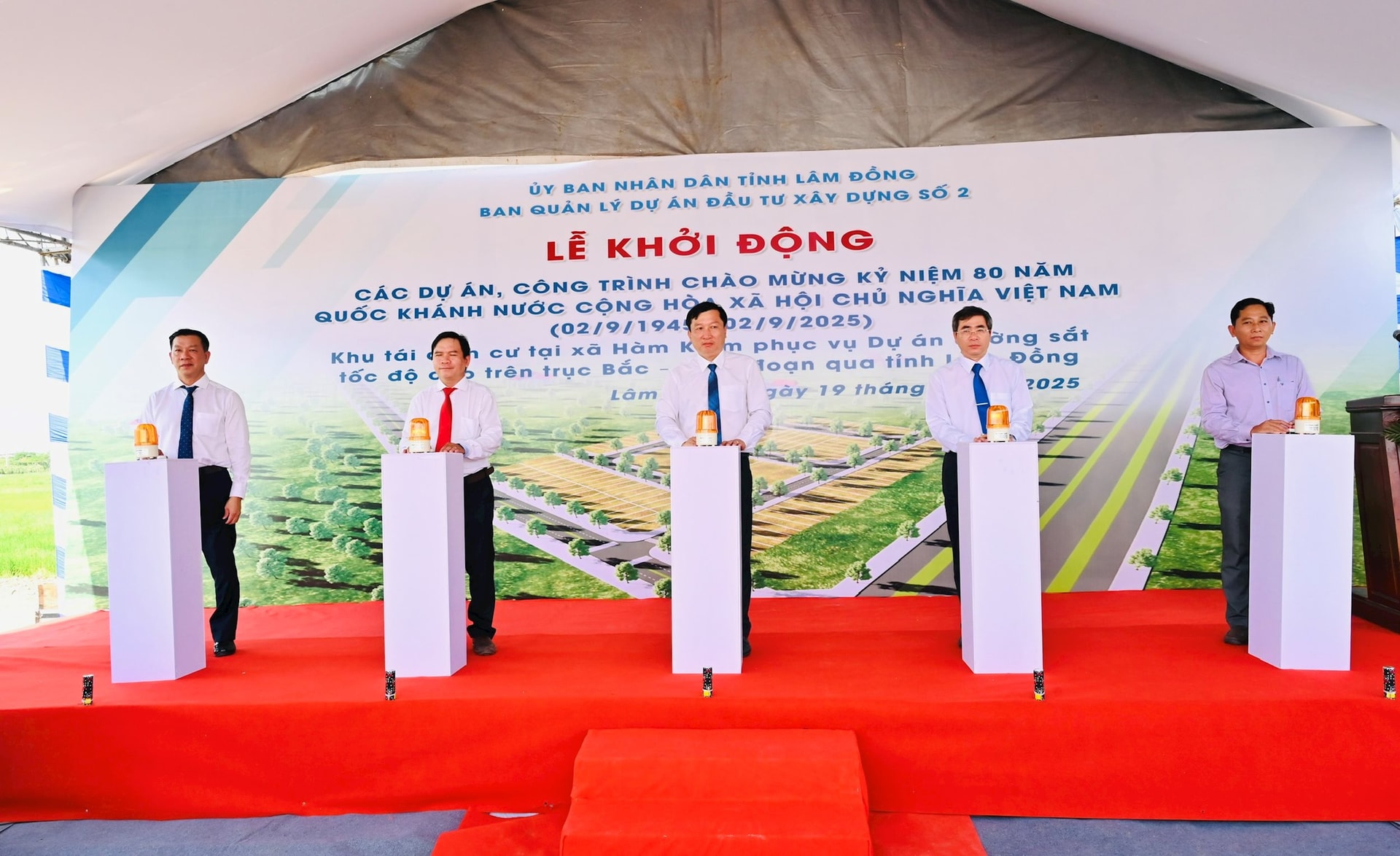 Lãnh đạo tỉnh, xã bấm nút Lễ khởi động dự án Khu tái định cư Hàm Kiệm. Ảnh: Đình Hòa